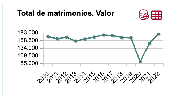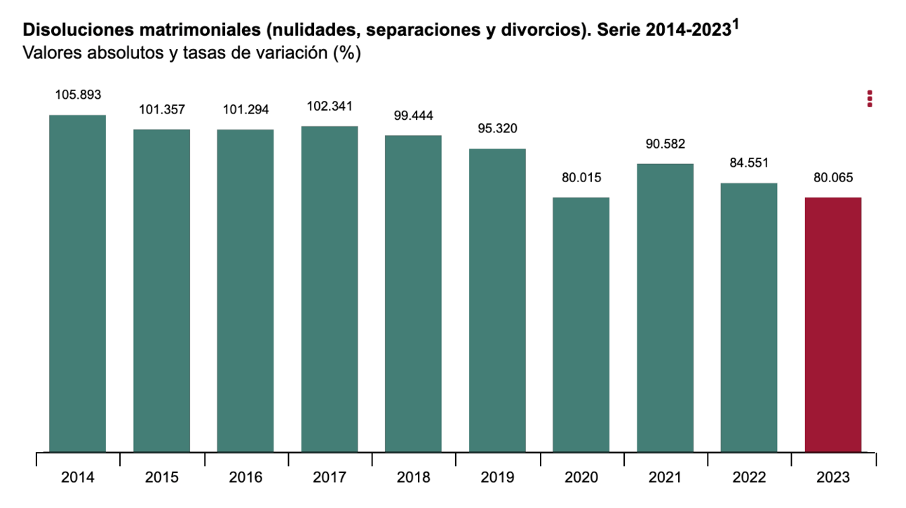 También vemos que en los últimos años con el Covid, los patrones de conducta habituales han cambiado, manteniéndose el descenso de los divorcios, pero deteniéndose los matrimonios en 2020 y compensándose después de 2021 y 2022.